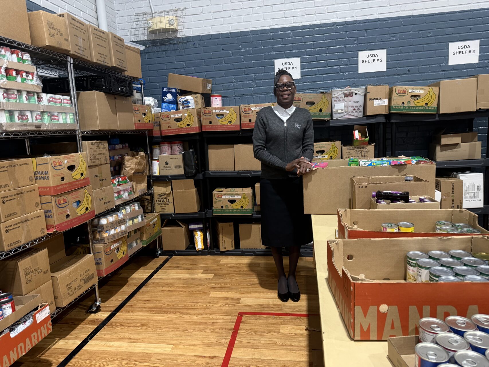 One of the most consistent stressors Michelle sees is food insecurity. “It runs out, right?” she says. That recurring uncertainty weighs heavily on families. That’s why the pantry, located near the gymnasium’s back door, plays such a vital role.